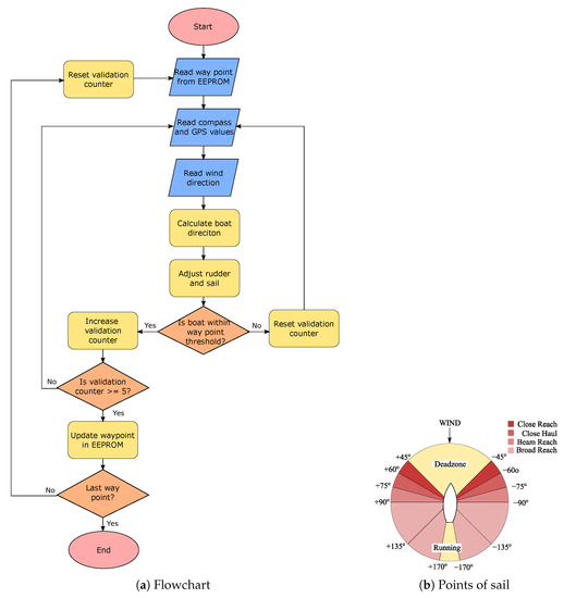 One of the most critical functions of the controller is the navigation algorithm, shown in Figure 3a. This algorithm uses information from all of the sailboat’s peripherals, as well as the waypoints from the EEPROM. The goal of the algorithm is to determine how to update the rudder and sail to make the sailboat reach the waypoint. Each waypoint has a threshold radius that is indicated when uploading the waypoint to the EEPROM. When the distance between the boat’s position and the waypoint is within the threshold radius, a validation counter is incremented. After five consecutive readings within the waypoint threshold radius, the algorithm advances to the next waypoint.