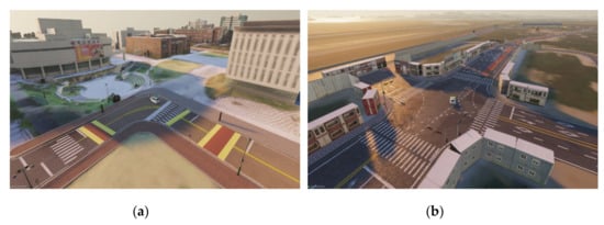 MORAI Sim Standard: (a) Chungbuk National University map; (b) KATRI K-city map.
