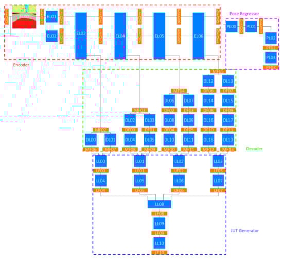 The network (Figure 2) consists of an encoder, a decoder, an LUT generator, and a pose regressor. As loss functions, segmentation loss in the encoder, LUT loss in the LUT generator, and pose loss in the pose regressor were used.