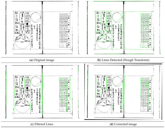 We detected lines using the Hough Line transform [33]. Due to the ink density of the original documents, written with calligraphy brushes, most of the long lines present in the documents (most importantly for us, the pattern lines) appear discontinuous in large zoom magnifications. This was a problem for deterministic versions of the Hough transform so we used the The probabilistic version [34] instead. Although we could detect lines, postprocessing was necessary in order to focus on lines pertinent for our orientation correction goal. Specifically lines under a set length where discarded as well as those with slopes that were not close enough to the vertical direction. Subsequently, we observed that many of the remaining lines could be grouped into longer lines. This happened because some parts of the original lines had sections that were faint or not visible. We grouped neighboring line endpoints and converted each group of lines into a “summary line”.