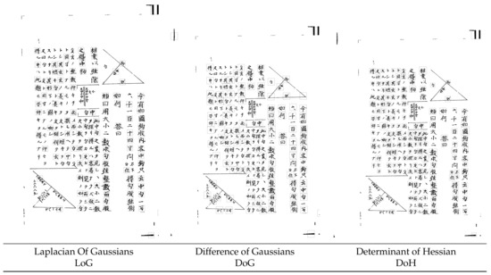 The characters appearing in Wasan documents were handwritten using calligraphy brushes. Each of these Kanji contains between 1 and 20 strokes. Consequently, each Kanji can be seen as small part of the image composed of smaller, disconnected parts. Furthermore, handwritten kanji (such as the ones in Wasan documents) often present irregular or incomplete shapes (see [17] for a succinct description of the particular challenges of handwritten kanji segmentation and recognition). We blob detectors to find the regions that are likely to contain Kanji in our images. We tested three different blob detectors implemented using the SciKit library [39]. Figure 7 presents an example of their results.