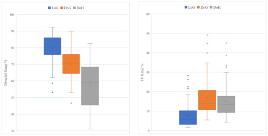 For each blob detector and combination of parameters, we considered the blobs detected as candidates for containing kanji. Then, by comparing these blobs with our manual annotation of the position of the kanji we were able to determine the percentage of kanji that had been correctly detected (“True Positives” TP) as well as the regions that did not actually contain kanji (“False Positives” FP). By comparing the number of TP with the actual number of kanji regions in the manual annotation we could also determine the percentage of kanji detected/missed. Figure 8 shows the boxplots for the correctly detected kanji percentage (left) and FP detections (right) for the three blob detectors considered.