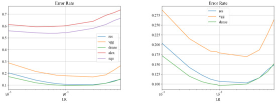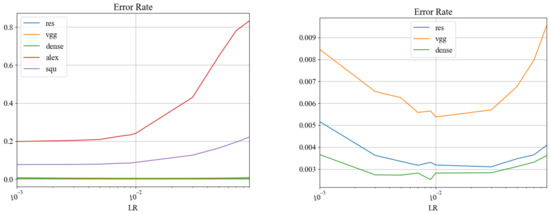 Both Figure 9 and Figure 10 show how best results were obtained by the bigger networks (Desenet, Resnet, VGG), with Squeezenet and Alexnet obtaining worse results. In both cases, the best results were obtained by the Densenet network with a similar performance obtained by the ResNet50 network. Best results were obtained at slightly different learning rates for each network, but all were close to LR = 0.01. For the ETL dataset, the best results in terms of ER for each network were: 0.0025 (Densenet), 0.0031 (ResNet), 0.0054 (VGG), 0.0773 (Squeezenet), and 0.1983 (Alexnet). For the Kuzujishi dataset, the corresponding results were: 0.096 (Densenet), 0.103 (ResNet), 0.169 (VGG), 0.538 (Squeezenet), and 0.593 (Alexnet).