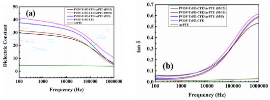Dielectric constant data for polymer mixes involving PVDF [16]. (a) Dielectric constant of ArPTU, PVDF-TrFE-CFE, and PVDFTrFE-CFE/ArPTU composite films; (b) Dielectric loss of ArPTU, PVDFTrFE-CFE, and PVDF-TrFE-CFE/ArPTU composite films.