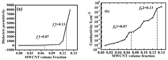 The percolation effect on the dielectric constant [23].(a) Dielectric Permittivity; (b) electricalconductivity of CNT/elastomer composites as a function of CNT loadings.