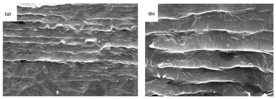 SEM micrographs of the graphene/PVDF composite containing graphene volume fractions of 0.0177 (a,b) [38].
