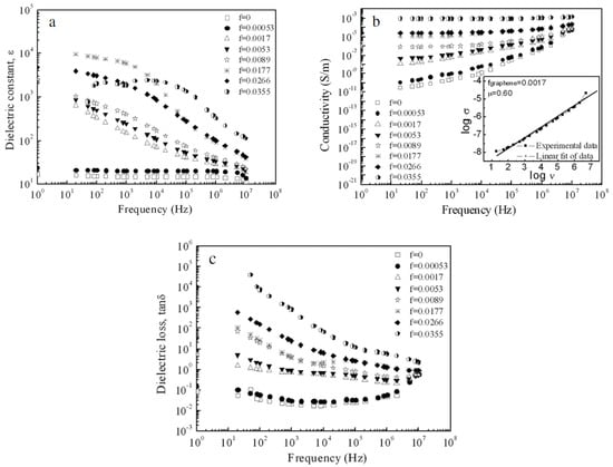 Dependences of (a) dielectric constants, (b) ac conductivities and (c) loss tangent on frequency for the graphene/PVDF composites at room temperature [38].