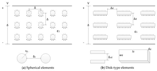 Considering the case of the spherical elements, the number Np of elements is given by Np = (VL) fv/(4/3Π rp3), where VL is the volume of the dielectric space. The distance Δ between the centers of the elements is