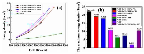 Energy density and breakdown data for mixed- polymer thin films. (a) The energy density of PVDF-TrFE-CFE/ArPTU composite films with different composite ratios; (b) Comparing of discharge energy density of our works with reported works [16].