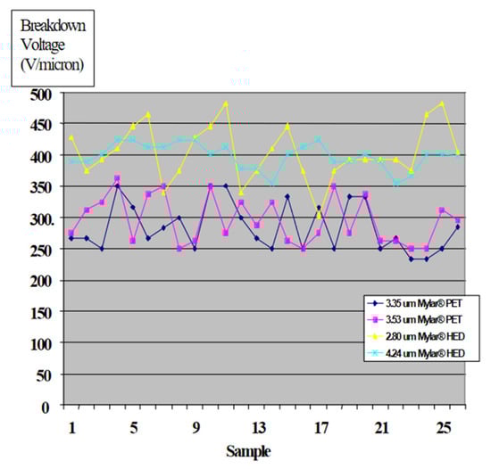 Ref. [55] involves the fabrication of spiral wound capacitors from flexible alkali glass (ε = 5.7) ribbons of thickness 50 µ. The capacitance of the device was only 70 nF with energy density of 1.2 Wh/L, but as shown in Figure 9, it was tested to 1000 V with no change in capacitance.