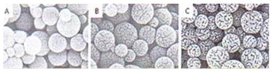 There has been research done to generate spherical carbon particles for use in electrodes for supercapacitors. Since the objective of the supercapacitor research is to prepare carbons with high specific capacitance (F/g), the pore size distribution in the carbon and not the geometric size of particles was of prime interest. As shown in Figure 10, Figure 11 and Figure 12, the particles appear to be nicely spherical, but their diameter is 100–500 nm in most cases [56,57,58]. The smallest diameter carbon spheres found in the literature was 50 nm, which is much larger than needed for the dielectric capacitors. Further work is needed to determine how spherical carbon particles having a diameter of 3–4 nm can be generated.