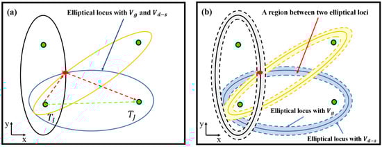 The damage locations are positioned at the intersections of most of the elliptical (when ) or ellipse-like (when ) loci. By neglecting nonzero , two different elliptical loci are derived from the left- and right-hand side of Equation (2), which are smaller and bigger than the ellipse-like locus, respectively. Moreover, no matter how small the difference between the two elliptical loci is, the ellipse-like locus indicating all the possible damage locations will situate at a region between the two elliptical loci. As shown in Figure 1b, two elliptical loci shown as dashed lines were plotted with the group velocities  and  in a sensing path, respectively, and the region between the two elliptical loci forms an elliptical ring, described by