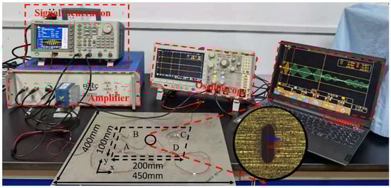 A global cartesian coordinate was introduced, the bottom-left corner of a rectangle with an in-plane dimension of 200 mm × 100 mm was at the origin, and the abscissa axis was parallel to the lower edge of the plate. Based on this reference coordinate system, the PZT transducers labeled as A, B, C, and D were bonded at coordinates (25, 10), (25, 90), (175, 90), (175, 10), respectively.