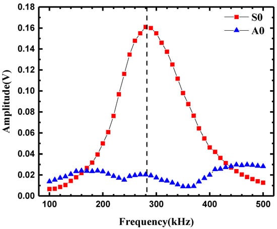 A mode-tuning experiment [] was conducted to determine the optimal excitation frequency of the S0 mode. A pair of PZT transducers with a distance of 170 mm was attached to the upper surface of the plate. The tone burst was applied to one of the PZT transducers to generate Lamb wave, and the other was used to receive Lamb wave signals. The excitation frequency of the tone burst was swept from 100 to 500 kHz in steps of 10 kHz. At each excitation frequency, the amplitudes of the S0 and A0 modes were recorded. Figure 3 shows the mode-tuning result. It can be seen that the amplitudes of S0 and A0 modes fluctuate periodically versus the excitation frequency. The amplitude of the S0 mode reached its maximum at an excitation frequency of 280 kHz, while the amplitude of the A0 mode was relatively smaller. Therefore, to obtain a sufficiently strong nonlinear effect and to restrain the A0 mode, the S0-dominated Lamb wave was excited at a frequency of 280 kHz in the experiment. At this frequency, the length of the small crack was much smaller than the wavelength of the incident wave (about 20 mm). The small crack could thus be considered as micro-damage [].