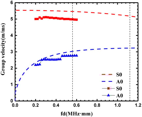 As shown in Figure 4, the results of the experimental testing and dispersion curves do not exactly agree with each other, which may result from the inconsistency between the theoretical and actual material parameters. Nevertheless, the results still show that there is effective actuation and reception of Lamb wave signals in the aluminum plate. It was found that the group velocity of S0 mode at a frequency-thickness of 0.56 MHz·mm was about 4978.6 m/s. Meanwhile, the group velocity at a frequency-thickness of 1.12 MHz·mm was about 4688.6 m/s as determined by extrapolation.