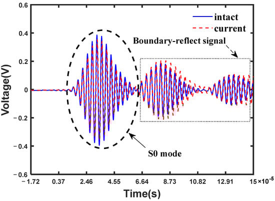 After the group velocity measurements, the arrival time of the damage-scattered signals was also necessitated for the ellipse methods. The received signals were first processed through a low-pass filter with a frequency of 1 MHz, which eliminated the high-frequency noise from the environment. Figure 5 shows typical waveforms of the signals received from the sensing path AB (A is an actuator and B is a sensor) in the intact and the current (with a small crack) states, respectively. The S0-dominated Lamb wave signal was more obvious, while the damage-scattered signals submerged in multimode and boundary reflection signals could not be directly recognized. Then, signal processing methods were applied to obtain the linear and nonlinear features of the damage-scattered signals.