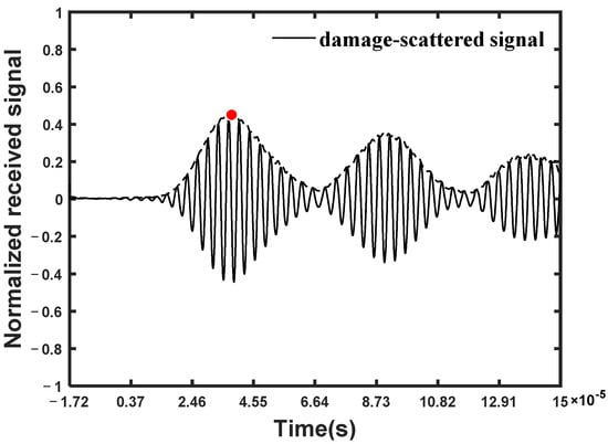 For processing the linear features, the received signals in the two states were normalized according to the respective maximum value, and then subtraction of the two received signals was performed to obtain the damage-scattered signal, as shown in Figure 6. The damage-scattered signal was further subjected to Hilbert transform to acquire an envelope curve, and the time corresponding to the maximum peak (red dot) of the envelope curve was taken as the arrival time of the damage-scattered signal.