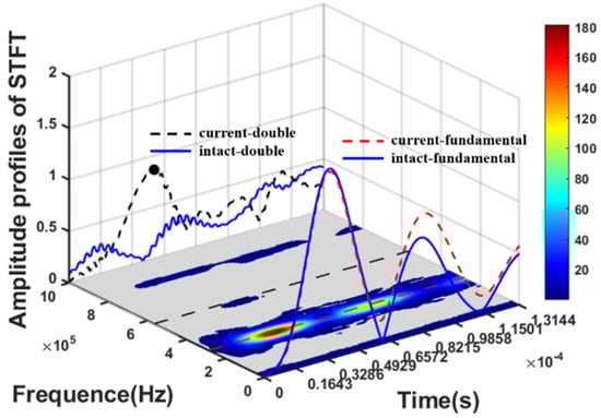 For processing the nonlinear features, short time Fourier transform (STFT) was applied to transform the received signals from the time domain into the time-frequency domain. Spectrogram of a received signal from the sensing path AB in the current state is shown in Figure 7, including amplitude profiles at the respective fundamental and double frequencies for both the intact and the current states. It was found that the amplitude profile at the fundamental frequency in the current state (red dashed line) was essentially the same with that in the intact state (blue line), while the amplitude profile at the double frequency in the current state (black dashed line) was higher and more obvious than that in the intact state. Due to interaction with the small crack, the amplitude profile at the double frequency had an extra hump in the current state, considered as the second harmonics of S0 mode. Thus, the time corresponding to the maximum peak (black dot) of the amplitude profile was regarded as the arrival time of the crack-induced S0 mode. The arrival time was also related to the length of the window function in the STFT as well as the absolute time between the excitation and the reception signals.