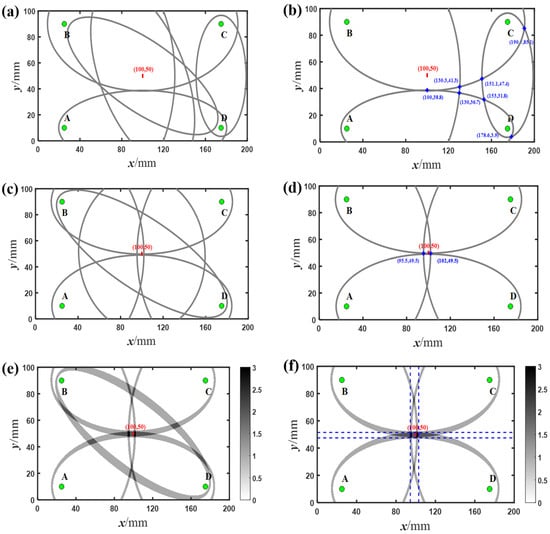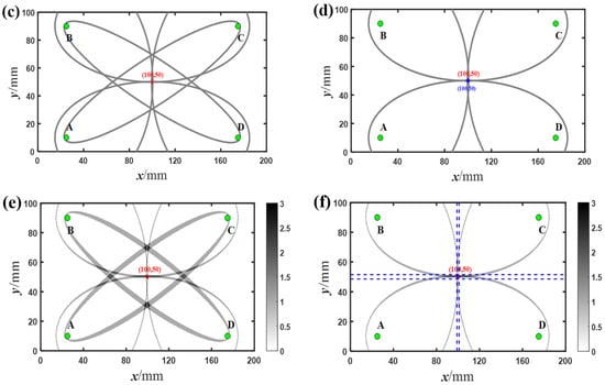 As shown in Figure 12a, the positioning results of the breathing crack based on linear features are not ideal. The elliptical loci from the sensing paths do not fall on the position of the breathing crack, including after removing signals received from the sensing paths AC and BD (Figure 12b). Meanwhile, the positioning results based on nonlinear features are shown in Figure 12c,d. Although many intersections of the elliptical loci create positioning errors (Figure 12c), the breathing crack is accurately identified and localized when the signals received from the sensing paths AC and BD are eliminated (Figure 12d). Furthermore, similar results are obtained when the modified ellipse method is employed, as shown in Figure 12e,f. It can be seen that the center of the breathing crack (highlighted with a red line) is at coordinates (100, 50); there are eight intersections (indicated by blue plus signs) of most of the elliptical loci based on linear features, and all are far away from the coordinates (100, 50). However, there is only one intersection of most of the elliptical loci based on nonlinear features at coordinates (100, 50). In addition, by drawing two vertical lines with x = 99 mm and 101 mm and two horizontal lines with y = 48.5 mm and 51.5 mm (blue dashed lines in Figure 12f, the intersection of most of the elliptical rings can be localized and highlighted. The damage location defined as the crossover area accurately situates at the actual location of the breathing crack at coordinates (100, 50). Moreover, the distance between the two horizontal lines within the crossover area can accurately estimate the length of the breathing crack (about 3 mm) in the vertical direction. It can be seen that when the length of the breathing crack is smaller than the wavelength of the incident wave at the selected excitation frequency, linear Lamb waves are not sensitive to the breathing crack and have limitations in identifying and locating micro-damages. In contrast, nonlinear Lamb waves can identify the breathing crack. Moreover, the breathing crack can be localized more precisely by the proposed method based on nonlinear S0 modes. This result is in good agreement with the experimental testing, thus verifying the effectiveness of the proposed method.