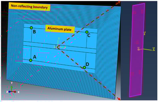 Hanning-window modulated five-cycle sinusoidal tone bursts at a central frequency of 250 kHz were excited by applying a pair of symmetric displacement on two points, which were symmetrically positioned on the upper and lower surfaces of the plate. Previous work [] has described in detail this type of point displacement modeling to generate single S0 mode Lamb wave. The displacement U3 at one point on the upper surface was monitored as the received signal. A global cartesian coordinate was also introduced, and the bottom-left corner of the plate was at the origin. The points for exciting and receiving signals were labeled as A, B, C, and D at coordinates (25, 10), (25, 90), (175, 90), (175, 10), respectively.