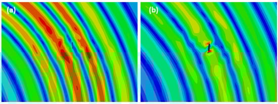 Figure 10 shows the process of the Lamb wave traversing the breathing crack. It can be clearly seen that the stress induced by Lamb wave propagation is continuously transmitted through the breathing crack when it is closed (Figure 10a), while on the contrary, the transmission process is interrupted when the crack is open (Figure 10b). This phenomenon is defined as so-called contact acoustic nonlinearity (CAN) [].