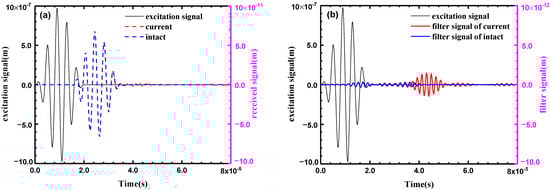 The excitation signal (left ordinate) and (a) the Lamb wave signal (right ordinate) and (b) the Lamb wave signal with a band pass filters (right ordinate) received from the sensing path AB in the intact and the current state.