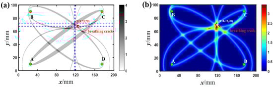 In addition, a probability-based diagnostic imaging (PDI) based on ToF for damage localization [] was also analyzed and discussed. In this imaging method based on the elliptical loci, probability distribution value was assigned to the virtualized grid nodes in the structure, and the greater the probability value of this location, the more likely the damage location. Under the same situation as Figure 13a, the identification result using PDI is shown in Figure 13b. As can be seen from Figure 13a,b, both the crossover area determined by the proposed method and the highlighted damage region defined by the PDI with a threshold fall on the actual location of the breathing crack with a certain dimension. It was found that these two imaging methods based on nonlinear S0 modes can achieve localization and imaging of the breathing crack more precisely. Thus, the modified ellipse method using nonlinear S0 mode Lamb waves may be a suitable candidate for identifying and locating micro-damages.
