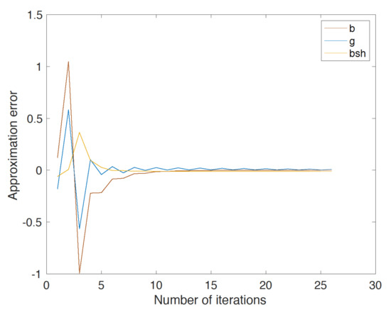 In this case, the parameters of line 23–32 are attacked. The first process of the framework is FDI detection. Results are presented in Table 1. One can see that the objective function is 1246.587, which is higher than threshold value (C = = 775.1861), thus a cyber attack is detected. For identification, a descending list of is built. From the resultant list, the largest absolute value of which is 8.4156 is related to reactive power injection for bus 23. In addition, one can see that the value of corresponding reactive power flow , real power flow and reactive power injection are also above the threshold value (). This situation is characterized as a parameter attack on line 23–32 [19]. For parameter correction, the process described in Section 2.1 is implemented. The results are shown in Table 2. In the state of the art parameter correction model [31] (also presented in (7)), one can clearly see that the model requires at least three different real-life measurements: two real power flow , and one reactive power flow measurement . However, there is no guarantee that the required measurements will exist. For example, in the current testing measurement configuration, only 1 real power flow measurement and 1 reactive power flow measurement are assumed to exist. Therefore, the correction model in (7) is unable to process the expecting correction due to the unavailability of the power flow measurement . To resolve this issue, in the presented framework, synthetic measurements are considered only for unavailable measurements. These synthetic measurements are generated by running WLS SE using weights obtained from machine learning linear regression prediction. For this task, no gross error detection analytics is performed. In this case, 358 SMs are generated (adding 358 SM yields a GRL increase from 3.029 to 4.55). Then, two synthetic measurements and are obtained and augmented from SM dataset. Parameter correction is processed by using 2 existing measurements and two synthetic measurements in the presented parameter FDI correction model (18). Results of such correction are presented in Figure 3. As one can see, the parameter correction process converges at 26th iteration while approximation errors for , , are , , respectively, which are all lower than state of the art model in [31]. After parameter correction is obtained, a new state estimation process is performed in which objective function is found to be 684.5437, which is lower than threshold value C. Hence, no FDI attack is detected.