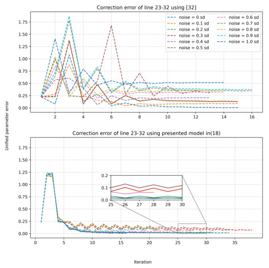 To further illustrate the robustness of proposed solution under different noise level, comparison result is presented in Figure 6. In Figure 6, the highest error of line 47–69 reaches 0.5 after system convergence when the noise level increase to 1 standard deviation using state-of-the-art solution (7), while using presented model (18) all values of , under different noise level, are lower than 0.06.