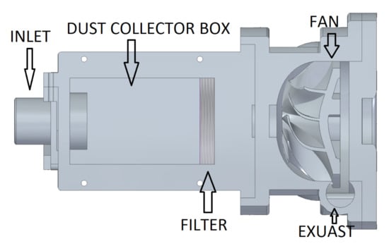 The vacuum system of the robot consists of 3D-printed parts, such as a fan, collector box, cover of the collector box, and fan chamber. Other parts include the filter, flexible pipe, and brushless motor. One end of the flexible tube is connected to the vacuum system and another end to the end-effector of the robotic arm. The collector box has a volume of 378 cubic cm (10 cm × 6 cm × 6.3 cm). Figure 2 shows the cut sectional view of the vacuum system. When the vacuum system starts vacuuming the floor, the air with the dust comes into the collector box, where the layer of vertical filter stops the dust, while allowing the air to pass through it.