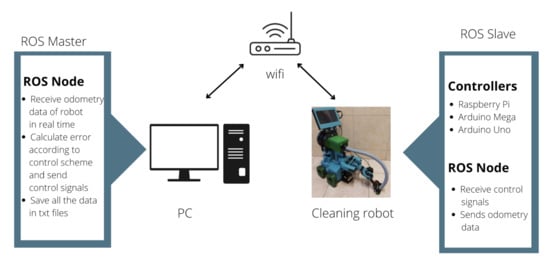 Two experiments were performed to verify the high-level controller explained in Section 3. A standard PC was used with the Linux system (Ubuntu 20.04) and the robot operating system (ROS) Noetic to collect data and implement the high-level controller. For the cleaning robot, Ubuntu LTS 20.04 with ROS Noetic was installed in the Raspberry Pi. The kinematic equations of the unicycle-like robot, low-level PID controller, odometry equations were installed in Arduino Mega (slave controller of Raspberry Pi). The PC and the cleaning robot were connected under the same Wi-Fi router to establish the ROS master and slave connectivity. The control algorithm in the graphical form is represented in Figure 3. The Figure 4 shows the real-time data exchange between the PC and the robot during the experiments. The high-level control algorithm was implemented in a ROS node written in Python language on the PC. In real-time, the odometry data coming from the robot were directly injected into the control algorithm to calculate the control signals for the robot. The calculated control signals were sent to the robot by the PC. The generated data were also saved by the PC as text files during the experiments. After completing the experiments, the authors used MATLAB software to plot the graphs from the text (txt) files. The control method was not very computationally complex, as it had 52 addition and subtraction operators, 54 multiplication operators, 19 sines, cosine, and hyperbolic tangent functions, and one exponential function. The computational complexity analysis was conducted for one obstacle.