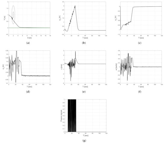 Experiment 2 results—(a) real and virtual robots path in -plane; (b) position errors in x direction as a function of time; (c) position errors in y direction as a function of time; (d) orientation errors as a function of time; (e) linear velocity control; (f) angular velocity control; (g) ’freeze’ signal.