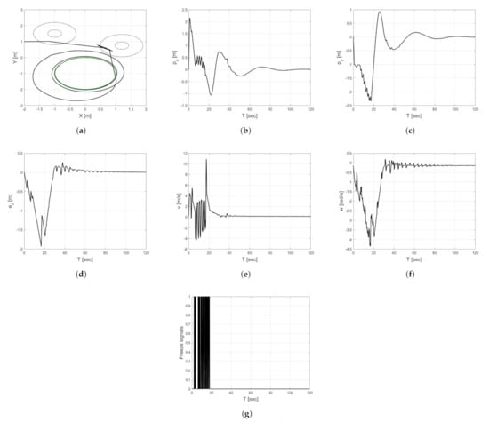 In this experiment, two obstacles were placed at (−1, 1.5) and (1.2, 0.75) coordinates, the virtual robot started from (0, 0) coordinates, and the real robot (cleaning robot) was placed at (−2, 1) coordinates. was 2, and was 2, obstacle radius r was 0.23 m, tu was 0.4 s, and R was 0.7 m. The total experiment was performed for 120 s. The linear velocity for the virtual robot was 0.15 m/s, whereas the angular velocity was −0.15 rad/s. The persistent excitation was where was a non-smooth pulse function of amplitude 0.5, 4 s period with the pulse width of 80 percent. Figure 6 shows the experimental results of this experiment. The scale of Figure 6a is 0.5 m for 1 unit of the x-axis and 1 m for 1 unit of the y-axis. Due to the scale, obstacles are not in a complete circular shape. Figure 6a shows the paths of both the robots in the XY plot. The green color indicates the path of the virtual robot, which starts from (0, 0) coordinates and moves in a circle in the anti-clockwise direction. The robot starts from (0, 1), avoids the two obstacles in its way, and converges to the desired trajectory at the end. Figure 6b shows the error in the x-coordinates as a function of time. As time passes, the controller helps the robot to achieve near-zero error in the x-axis. Figure 6c shows the error in the y-coordinates as a function of time, which also shows that error in the y-axis converges near zero, due to the controller. The robot orientation error also tries to converge to zero, as shown in Figure 6d. The real-time control signal generated by the controller (linear velocity and angular velocity) for the robot can be shown in Figure 6e,f. However, in these plots, some high linear velocities and angular velocities are generated. In that case, the real robot only moves to its top speeds. Freeze signals for the robot can be seen in Figure 6g, where zero means no freeze signal is generated and one unit shows that the robot is frozen. These are generated by the controller when the robot is in the potential field near the obstacle.