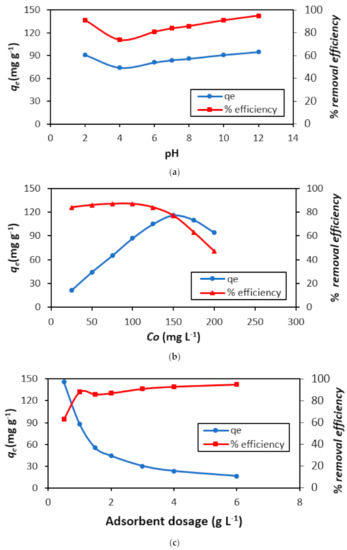 Measurements as a boundary will significantly impact the commercialization of the cycle since it chooses monetary achievability [27]. The expulsion of BG color from the arrangement diminishes the following adsorbent enhancement up to 6.00 gL−1. Then again, it was observed that the percent of BG color evacuation expanded pointedly with an increment in adsorbent measurements from 0.50 to 1.00 g L−1. From that point forward, minute expansion in the efficiency of eradication was observed (Figure 4c). Observations were made from a process commercialization perspective. Several attempts using minimum adsorbent quantity extensively improvised adsorbent dye removal efficiency.