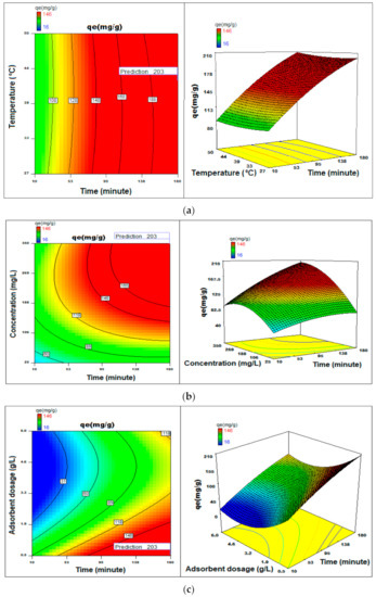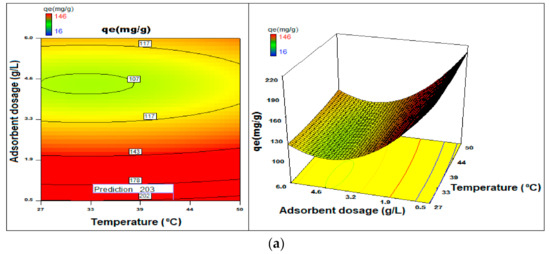 Nonetheless, expanded time can work on the course of sorption. Figure 12e and Figure 13a,b 12 h for temperature against other autonomous factors, demonstrate that the temperature has a beneficial outcome with any remaining variable on the reaction. Figure 13c–e plotted for the initial dye concentration against other variables indicate that an increase in the initial concentration has a positive effect on adsorption capacity.