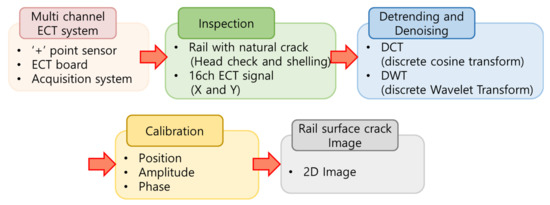 - Xu, P.; Zhu, C.L.; Zeng, H.M.; Wang, P. Rail crack detection and evaluation at high speed based on differential ECT system. Measurement 2020, 166, 108152. [Google Scholar] [CrossRef]