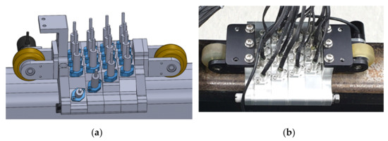 The jig was constructed as shown in Figure 2a,b such that the 16 sensors could be secured and the entire rail surface could be inspected. The sensor spacing in the direction of rail propagation was set to 18 mm, and to inspect the entire rail head, the sensor spacing between the rail propagation direction and vertical direction was 3.8 mm, which resulted in a total of 57 mm. The jig to which the sensors were connected was divided into four parts and could be disassembled and reassembled. Four sensors were combined onto one jig apparatus, and the arrangement of the sensors could be changed by disassembling and reassembling the jig. Furthermore, a constant lift-off distance from the wheels attached to the jig to the rail surface could be maintained.
