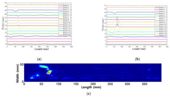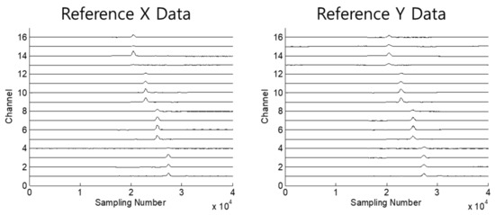 As shown in Figure 2 because the sensors are not on a straight line arranged in a 4 × 4 as shown in Figure 5a. Therefore, when scanning the test piece in Figure 4, it was possible to obtain the results shown in Figure 5a. Since the actual defect lay in a straight line, a position correction was required, and a calibration value that minimized the amplitude difference between sensors was required.