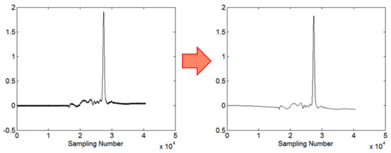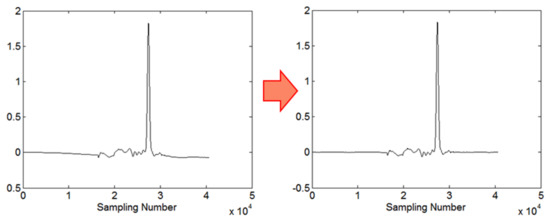 Since the noise of the signal prevented the identification of the location of the defect or acted as an error in analyzing the size of the defect, noise removal was performed through denoising. The denoising technique used in this study was “DC Offect”, and signal processing was performed by applying data between the initially generated low frequency and a specific high frequency. Figure 7 shows the denoising process, and it was confirmed that the noise disappeared as a result of applying “DC Offect”.