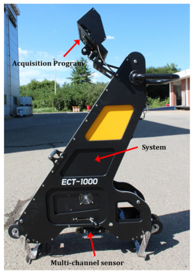 In order to carry out the inspection at a long distance in the field, the equipment shown in Figure 9 was manufactured. The multi-channel sensor has 16 transducer channels built in, and the system is equipped with power and sensors for collecting signals, and the acquisition program can be installed on a tablet PC to lighten the equipment. The inspection speed of the equipment was set to 2 km/h, compliant with the average walking speed of most people.