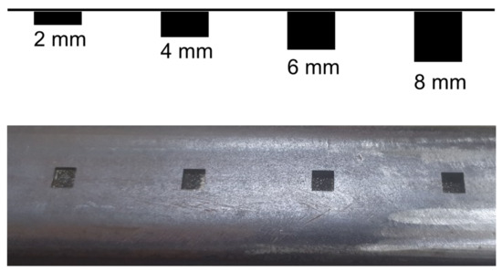 In order to derive the relationship between the depth and the phase of the defect, as shown in Figure 10, the artificial defect specimen was constructed with four squat defects on the UIC60 sample. The depths of the defects were 2, 4, 6, and 8 mm, and the lengths and widths were all 10 mm.