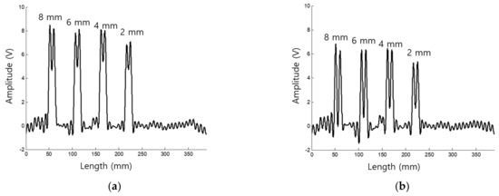 Figure 11 shows the results of the scan of the artificial defect specimen. Figure 11a is the X data (resistance) of the eighth sensor, and Figure 11b is the Y data (reactance). As shown in Figure 11a,b, detrending and denoising were performed through signal processing. As a result of applying calibration, it was confirmed that two peaks were generated when the detector passed through the defect. These two peaks are the start- and endpoints of the defect, and the length of the defect can be measured using the two peak points.