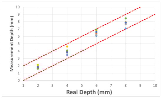 Figure 13 shows the results of estimating the depth of artificial defects according to the depth change through a total of six repeated experiments. The red dotted line in Figure 13 is an error bar of ±1 mm, and it can be observed that there was no point beyond the error bar. Therefore, it is possible to estimate the depth of the surface defects of different specimens using the correlation between the depth and the phase of the derived defect.