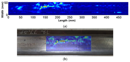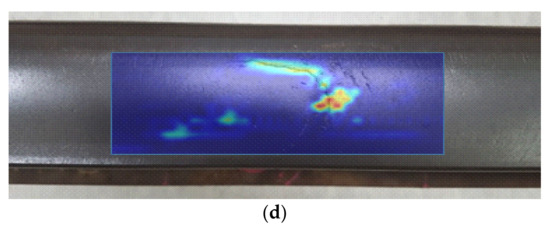 Figure 14c shows an image similar to the shape of the specimen as a result of calibration. The image shown in Figure 14d was used for an exact comparison by overlaying the defect part in Figure 14c with the image of the actual defects, and the results were shown to be consistent with head check defects.