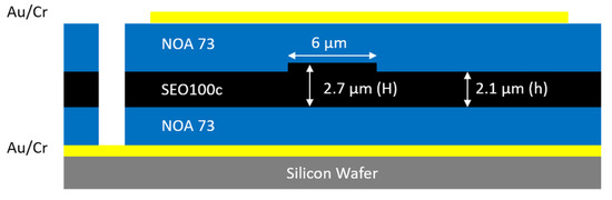 To create the core layer, a vial with 0.5 g of SEO100c had 7.45 g of dibromomethane added. The solution was then mixed on a rotator at 35 rpm for 8.5 h. Once mixed, the SEO100c was passed through a 0.2 μm nylon filter and allowed to settle for 30 min. After settling, the SEO100c was deposited by a static spinning process with a spin speed of 1000 rpm for 40 s producing a 2.7 μm-thick core layer. The wafer was then baked in a vacuum oven at 75 °C for 18 h.