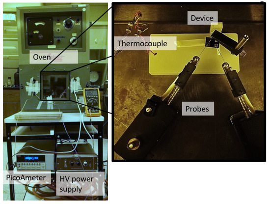 Figure 2 shows the setup used for poling. A small oven was used to heat the device. A high voltage DC power supply had the positive lead connected to top electrode via a probe and the negative lead connected to a pico-ammeter through a HV protection circuit, then to the bottom electrode of the device. The current data from the ammeter and temperature data from a k-type thermocouple were digitally logged during the poling process.
