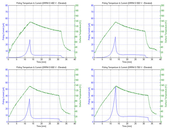 Poling temperature (green) and current (blue) for a waveguide stack poled at 400 V, 500 V, 600 V, and 700 V.