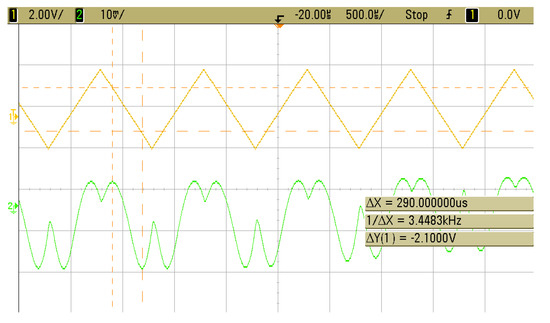 Data was collected for frequencies of 40 Hz, 100 Hz, 500 Hz, and 1k Hz using the oscilloscope. Figure 5 shows an example modulation to measure Vπ. Vπ was measured for each set of data and r33 values were calculated using Equation (2) [16].