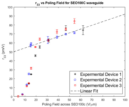 Data was collected at four frequencies, 40 Hz, 100 Hz, 500 Hz, and 1k Hz. The presented r33 for each poling voltage is the average r33 of these four data points. The error bars were determined by calculating the standard deviation of the data set at each poling voltage. The resulting data show two distinct regions of r33 as a function of poling field: a non-linear region at low poling voltages (<25 V/μm across the EO core) and a linear region for higher poling voltages as shown in Figure 6. The r33 values obtained at the lower poling voltage resulted in a non-linear region. This effect has been attributed to there being insufficient voltage to overcome the resistance to chromophore movement in the poled device. This resistances of chromophore movement is caused by the chromophore being tangled within the host polymer [17,18]. The linear region shows an increase of 0.37 pm/V for every 1 V/μm of additional poling field strength. This trend can be extrapolated to find an r33 of 93 pm/V at 100 V/μm poling, which is the poling field specified by the data sheet to achieve the maximum r33 value. Higher voltages were avoided as they would increase the risk of device damage, and fields in excess of 77 V/μm would cause sparking damaging the top electrode.