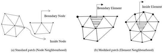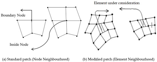 The recovery of the field variable (displacement) is obtained by the least-squares fit of the computed nodal field variable (u) using a higher order polynomial over an element neighborhood patch that consists of the union of the elements surrounding an element (Figure 1). To perform least-squares fitting, the following function is minimized: